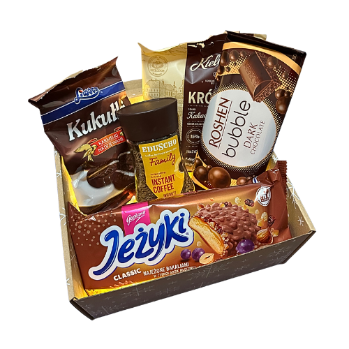Kukułki 80g, Krówki 200g, Czekolada Roshen 80g, Jeżyki 140g, Kawa Tschibo 50g