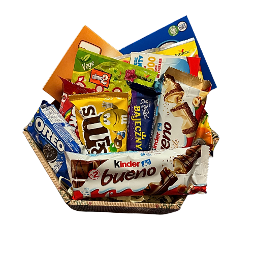 Toffifee 125g, Oreo 176g, Boomki Nimm2 90g, Żelki Nimm2 90g, Baton Bajeczny 45g, 2x Kinder Bueno 39g, M&M's 45g, Skittles 38g, Oreo 44g, Kinder Czekoladki 100g