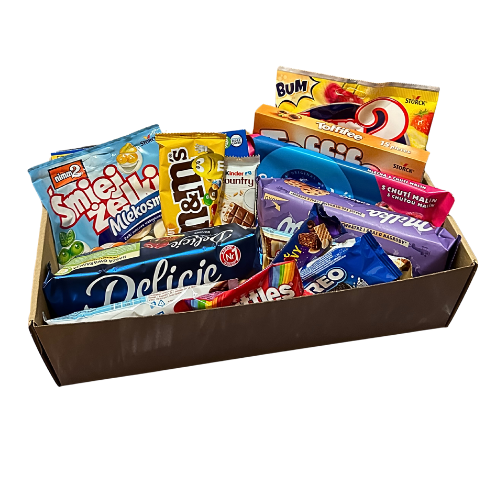 Oreo 176g, Żelki Nimm2 90g, M&M's 45g, Kinder Country 23,5g, Boomki Nimm2 90g, Toffifee 125g, Czekolada Studentska 170g, Milka Pieguski 135g, Delicje 147g, 2x Kinder Bueno 39g, Baton Bajeczny 45g, Oreo 44g, Skittles 38g