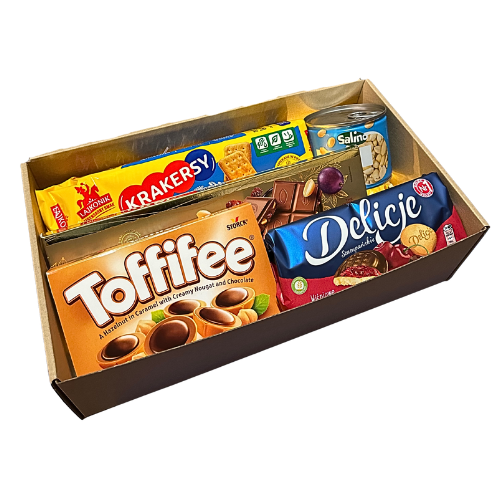 Krakersy Lajkonik 180g, Orzeszki Salino 150g, Czekolada Terrawita 225g, Toffifee 125g, Delicje 147g