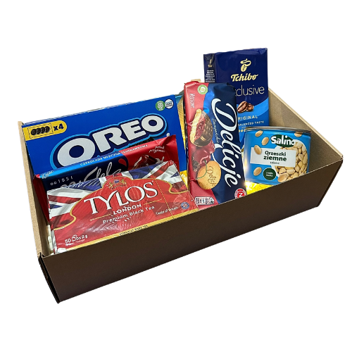 Oreo 176g, Czekolada Wedel 90g, Delicje 147g, Kawa Tschibo 250g, Orzeszki Salino 150g, Herbata Tylos 50szt,