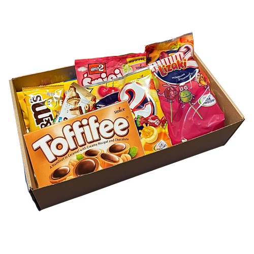 Krakersy Lajkonik 180g, M&M's 45g, Żelki Nimm2 90g, Boomki Nimm2 90g, Lizaki Nimm2 80g, Kinder Bueno 39g, Toffifee 125g